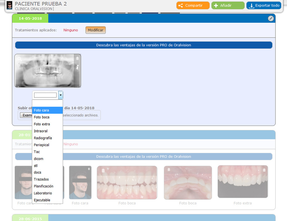 Para indicar las pruebas que se han subido de forma manual en la pestaña galería, basta con desplegar el listado y pinchar sobre el tipo de prueba deseado, de esta forma el paciente tendrá activa dicho tipo de prueba en el listado de pacientes cuando aparezca.